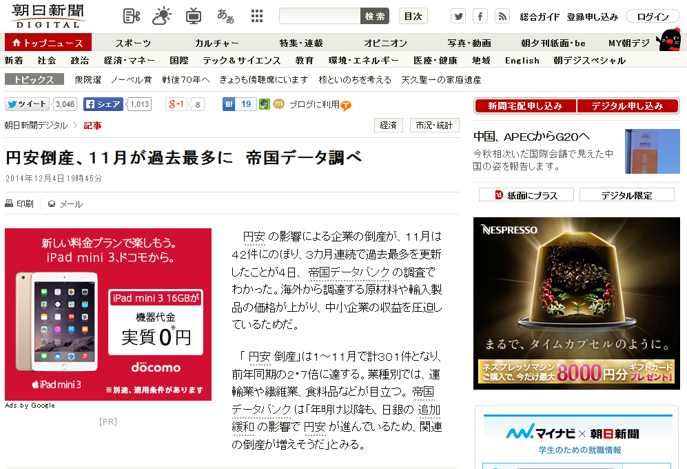 負債総額は1338億6000万円、5ヵ月連続の前年同月比減少 http://t.co/byrOxRLd1W →朝日新聞が「円安倒産過去最高」とかデマ流しているのでソースの帝国データバンクの数字を確認。やっぱり朝日は嘘つきだった。