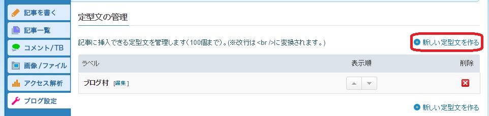 「ブログ設定」>「定型文」>「定型文の管理」で定型文を登録しましょう。