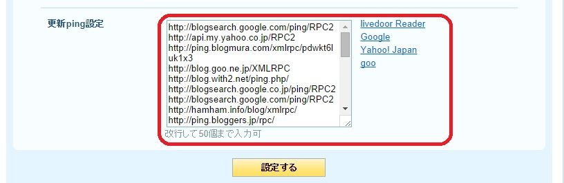 「ブログ設定」>「投稿設定」>「更新ping設定」で追加しましょう。