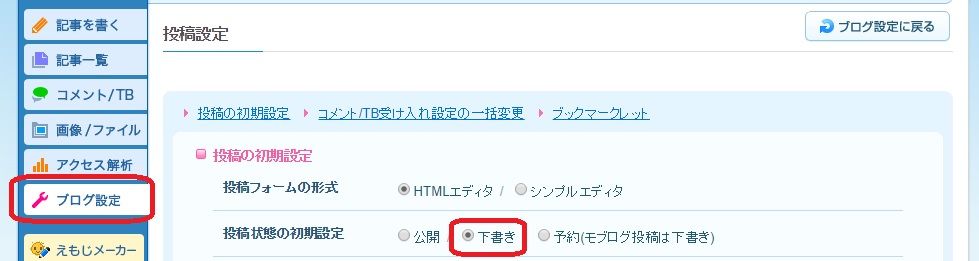 「ブログ設定」>「投稿設定」>「投稿状態の初期設定」で「下書き」をチェックしましょう。