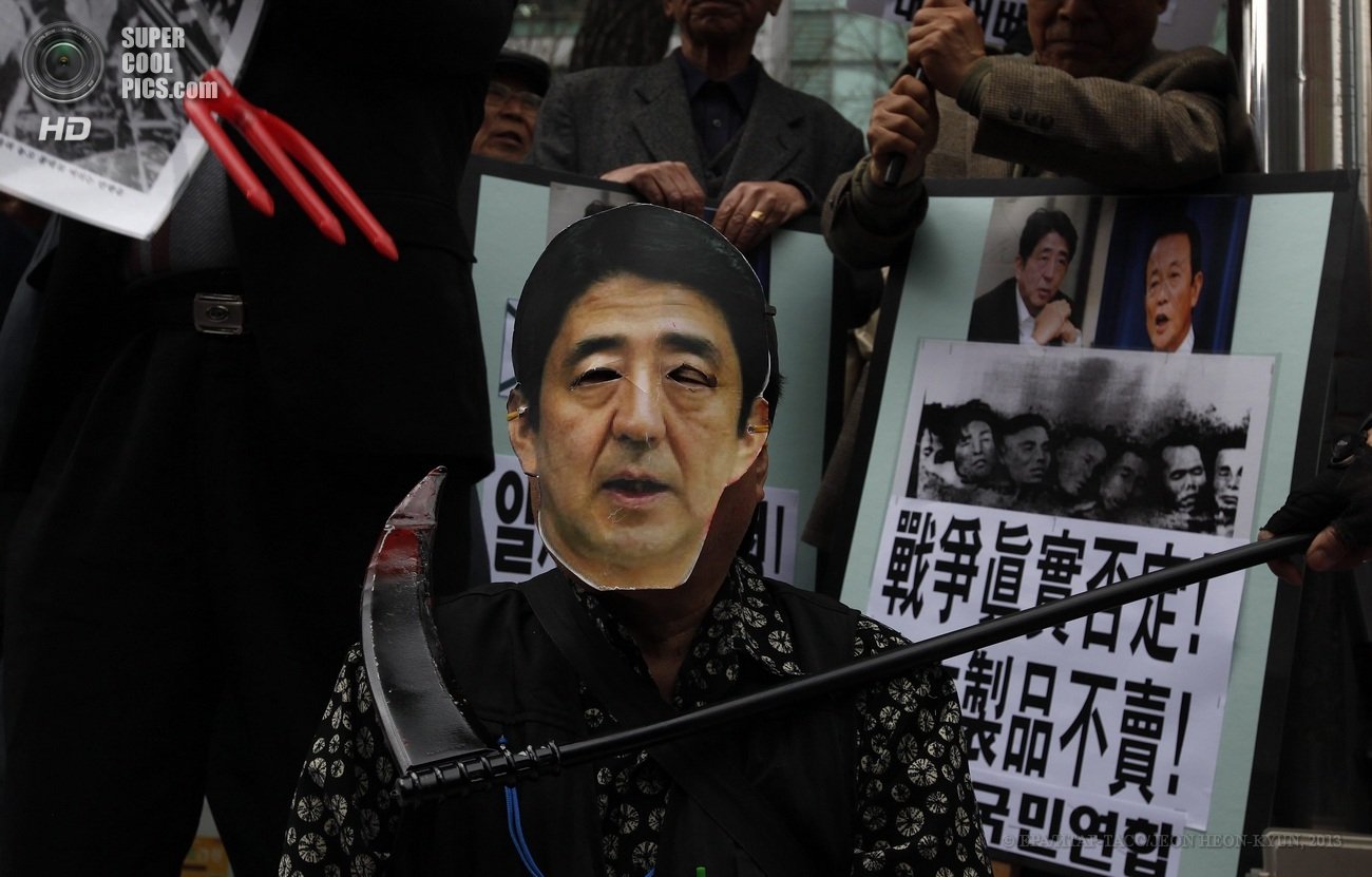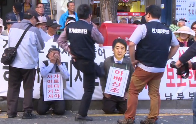 (安倍首相のお面を被った人に罵声を浴びせる韓国人↓)