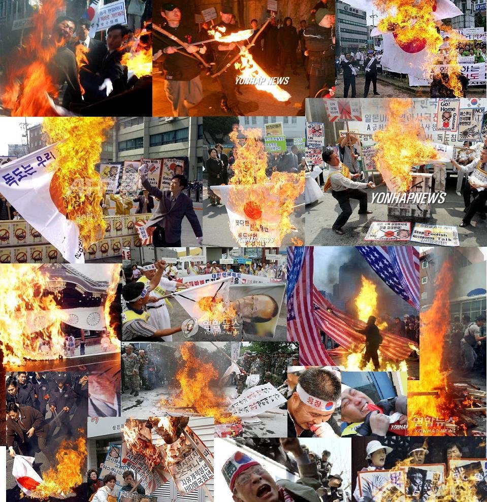 (日本の国旗を燃やして、やっちまえ、ぶっ潰せと大はしゃぎする韓国人↓)