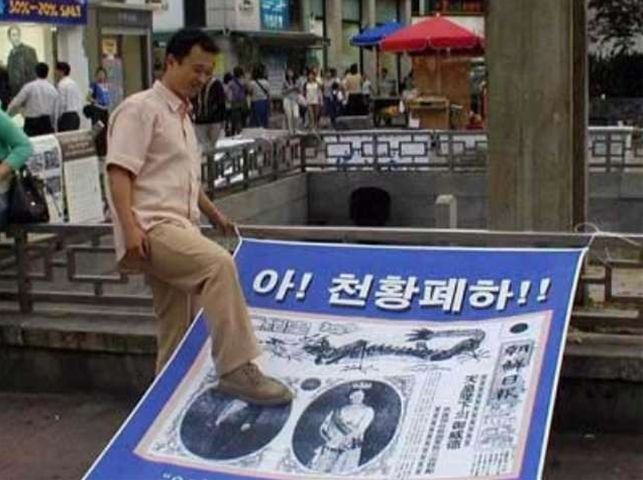 (天皇陛下の写真を踏んづけて喜ぶ韓国人↓)