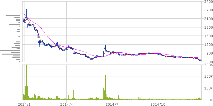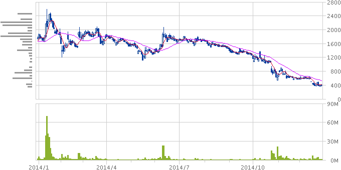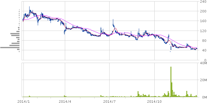 ライツ、MSワラントなど形振り構わない株券印刷によってなんとか上場を維持するも業績は改善せず、スーパーの特売品より安い株価に。投資家と消費者のメガネにはかなわなかった。