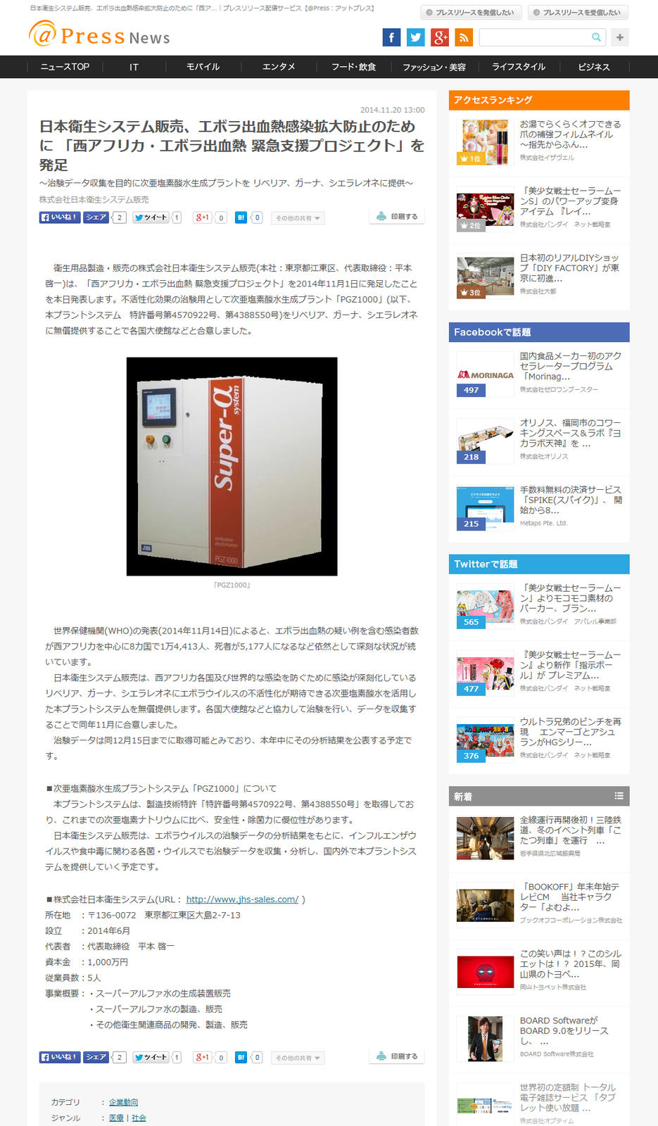 エボラ出血熱が西アフリカで深刻な状況にあります。「スーパーアルファ水」がウィルスに対して強力な効果を示す実績が評価され、