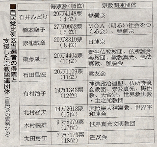 記事自体は、安倍首相や閣僚の靖国参拝問題に絡めて、参院選で自民党候補者を支援した宗教関連団体の意見対立や宗教票の影響力増大などの諸問題について記述されたものだ。記事冒頭の自民党比例区当選者の得票と支援した宗教関連団体 (自民党の資料から)の一覧表には、北村議員が世界平和連合から支援を受けていたことが明記されている。