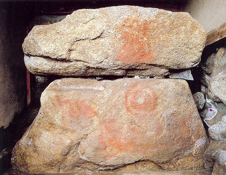 ここでは石材が他の古墳より小さいため、文様も小さめに描かれている。使用した色は赤一色であり、石材が表面の荒い花崗岩であるため、文様はぼやけ気味でシャープな線ではない。