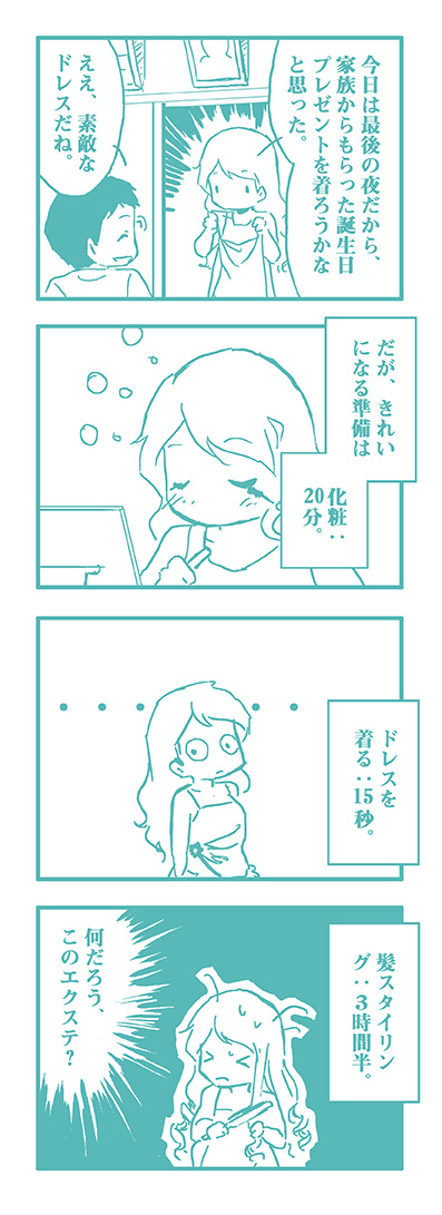 でも漫画って、すごいものでしょう。私のつまらない人生も、四コマ漫画として、面白くなりました(しかも、日本語の失敗は本当に申し訳すみませんです)。このブログが急に始まった、急に終わったものです、ハハ!でも知らないですよね。たくさん時間があれば、またブログの再スタートをするかもしれません。(^_^)