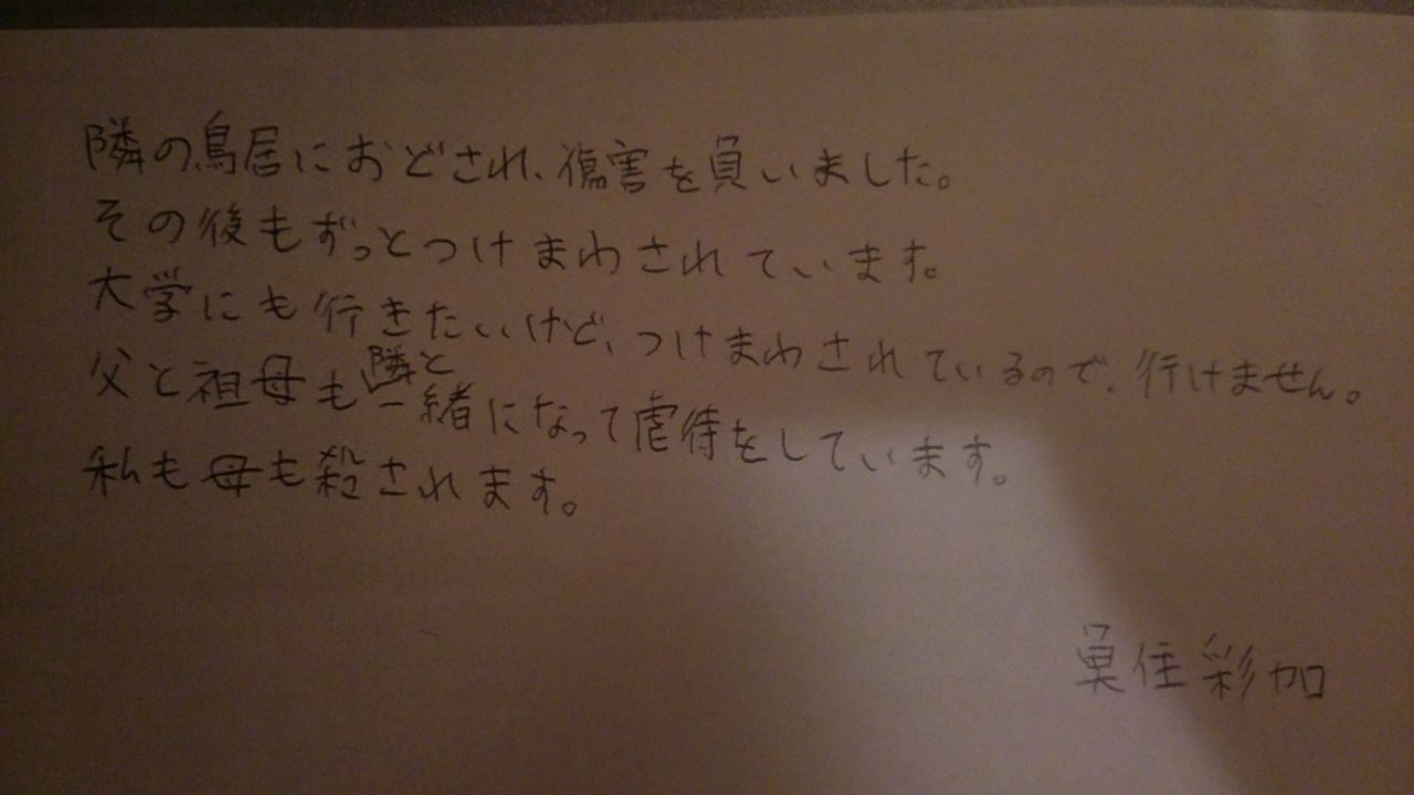 隣人、鳥居直子・鳥居幸雄・鳥居幸子・鳥居達雄(兵庫県明石市岬町9番10号)一族に殺すぞと脅され、かたわにされ、救急者で運ばれました。 そして、自宅から追い出されました。
