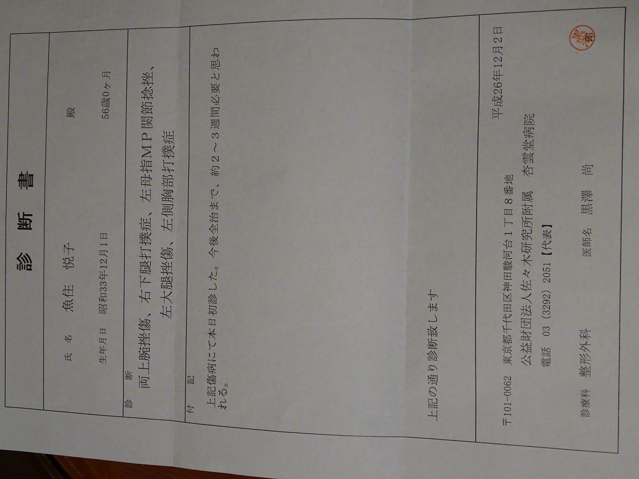神奈川県警川崎署の警察官に暴行された時の診断書