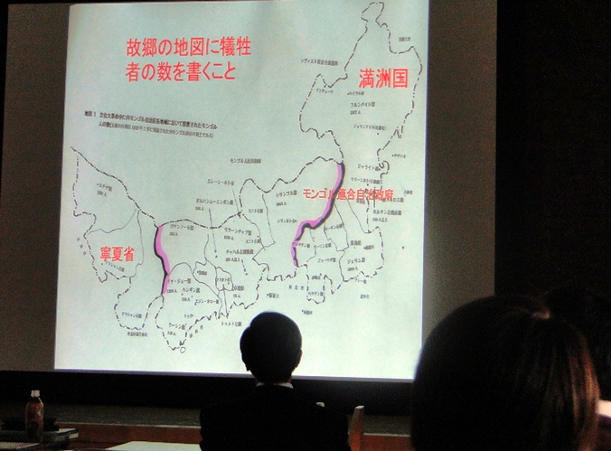 2012年10月27日,由《蒙古文化促进会》举办的首届《在故乡的地图上标记牺牲者》--文化大革命与蒙古人被大量屠杀事件主题演讲会在日本兵库县留学生会馆举行。