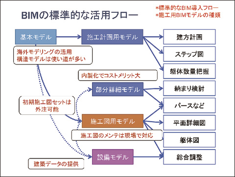 図「BIMの標準的な活用フロー」。チームワーク機能を活かして専門工事業者や外注の施工図事務所と協働するなど、基本モデルは、目的に応じて再加工され、詳細度の高いBIMモデルとして施工現場へと至る。