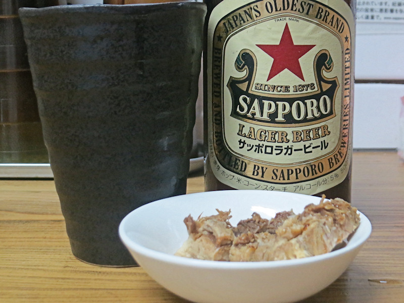 ビールを一杯注いだところで付き出しとしてチャーシューの切れ端が出され、塩加減といい漬け込み具合と言い、美味しいですね。