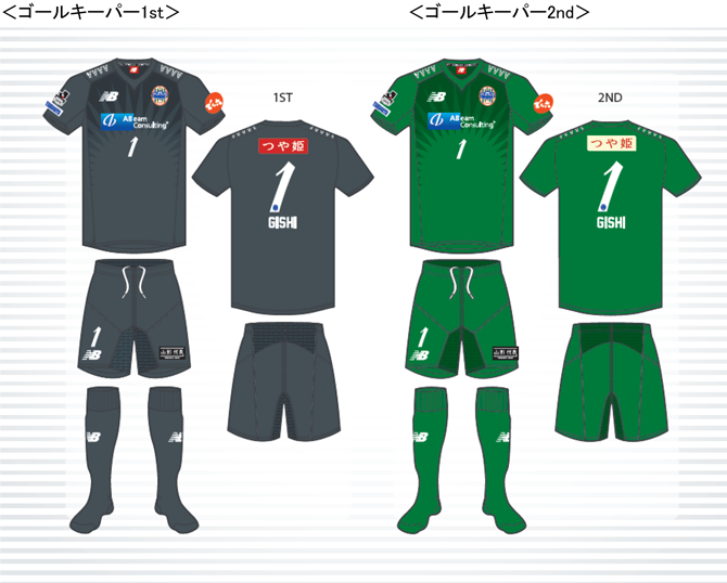 1stユニフォームは昨年と同様グレーを基調とし、堅く守り、鉄壁な守のイメージカラーを採用し、2ndは緑豊かで自然に囲まれた山形をイメージした緑を採用。胸部分にはゴールを守る最後の砦として立ちはだかる存在感を示す放射線状の紋様で表現しています。