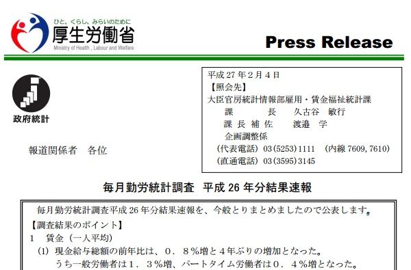 ありがたくも「調査結果のポイント」と“誘導”してくれてます。賃金については(1)から(6)とあるわけですが、強調したい点からそりゃ書いていくよね(笑)官僚も官邸の意を斟酌しているのかは分かりませんが、「アベノミクスの成果」を強調すれば失点は無い。当然、(1)は「現金給与総額の前年比は、0.8%増と4年ぶりの増加となった」。そして一番最後の(6)が「実質賃金指数(現金給与総額)の前年比は、2.5%減となった」と申し訳程度に付けてまして、この見出しを見るだけで記事の骨子が作れる。まあ、古賀さんや長谷川さんのご高説を聞くまでもなく、発表モノについてはよくよく後で吟味する必要があるなと自省を込めて思います。