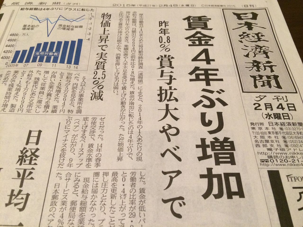 主見出しは上記の通り、「賃金4年ぶり増加」でドドンと。そして“2番手”扱いのサブ見出しは「昨年0.8% 賞与拡大やベアで」とありまして、もう大体の人はここで「へー、なんだかんだで世間では給料上がったのか」と思ってしまうわけです。私も結構、専門外のことは情弱なので、以前なら漫然と頷いてしまったでしょう。