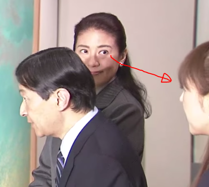 奥さんと彼女に挟まれ、緊張しながら目が縦線になる浩宮。