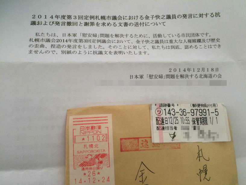 「日本軍慰安婦問題を解決する北海道の会」なる団体から抗議文が届きました。