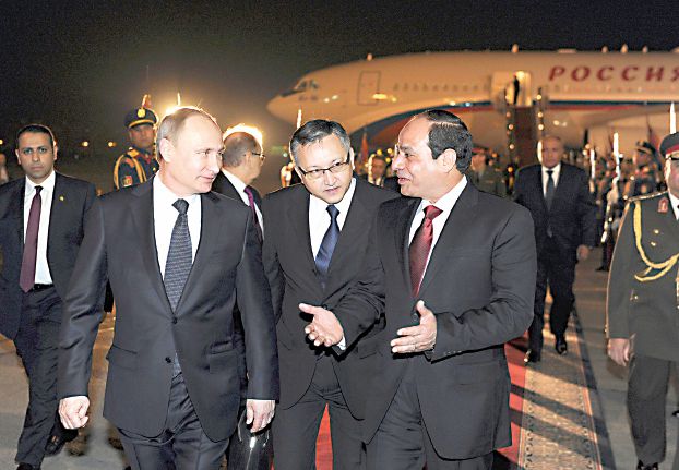 スィースィー大統領は、昨日プーチン大統領をカイロ国際空港に迎え 、その後ヘリコプターでエジプトオペラハウスに同行した。オペラハウスにおいてはエジプト・ロシア関係の歴史に関する文化的展示を見学した後、スィースィー大統領によるプーチン大統領歓迎の晩餐会が催された。カイロの街路には、プーチン大統領の写真と「偉大な賓客」と書いた歓迎横断幕が溢れかえった。