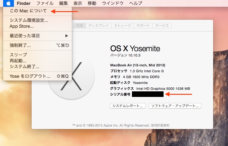 対象モデルとなるMacBook Proを調べるには、メニューバーの「この Mac について」からシリアル番号をコピーして、「保証状況とサービス期間を確認する」ページに入力すれば確認できます。