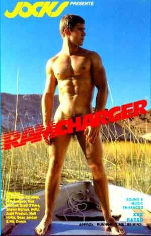 Ed Wiley drives downstream to find the blond Roger Holtz getting off the water. Ed helps him ashore and they find a they find a secluded spot to get it on. Roger quickly goes down on Ed who gets his jeans down to his ankle and kneels on a sleeping bag for a writhing rim/reverse blow job. Finally out of all of his clothes he kneels while Roger rubs Ed's face into his crotch. Roger strips off his red shorts to reveal the white jock strap seen in Ramcharger 2. Ass high in the air Ed Wiley pounds the hell out of him. Suddenly, Ed is biting his boots to deal with the fucking he is getting from Roger. With Ed on his back, Roger comes on his stomach and Ed uses the white juice to lube his own dick to orgasm doing his trademark dick on tongue trick. Roger licks him clean and the recover in a full length embrace lying out in the sun. Exhausted, they stagger up from the sleeping bag and head back to the river for some horseplay in the water.