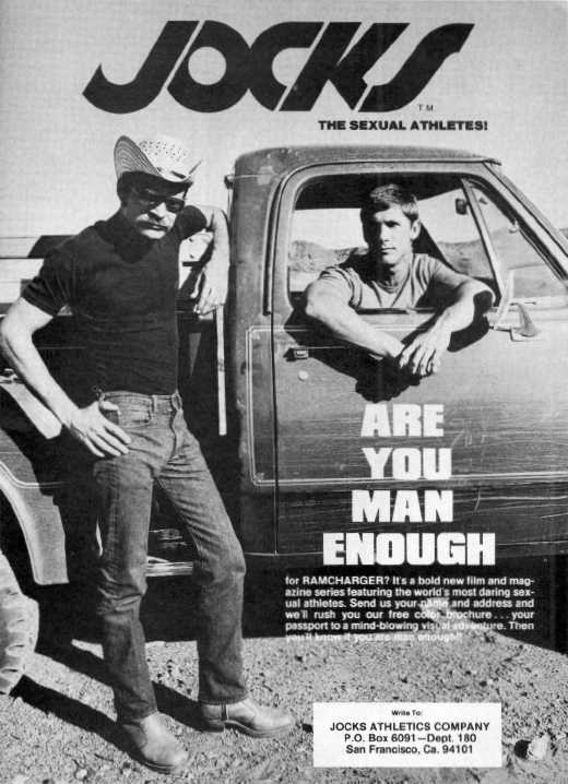 Ed Wiley and Bob Bishop, wearing those small shorts from those tight clothing times) meet at a gas station in their big trucks. Gas stations might be a big cruising ground, but the two head off into the desert for some private fueling. Bob strips off his t-shirt and Ed can't resist grabbing the thinly covered globes of Bob hot round ass. Bob gingerly gropes Ed's crotch and does a brief suck on Ed before they start grappling each other. Ed invites Bob back to his truck and gets to sit on the tail gate while Bob deep throats his big cock. Ed returns the favor as bob stands and then cums on Ed's hairy chest. Ed bends Bob over the truck tailgate and give him a rim and thumb job that would loosen the tightest of holes. Bob uses his boots to encourage Ed to penetrate him. Still in his jeans, Ed fucks the muscular shoe-clad-only Bob with lots of restless action and close-ups of much all-the-way-out and back-in motion. He comes on Bob's rippling stomach and then licks his own cum up before tonguing Bob's face. Lots of full on photography that accentuate the man-beauty especially Bob Bishop's blond-Adonis like body. [See picture magazine Jocks.]