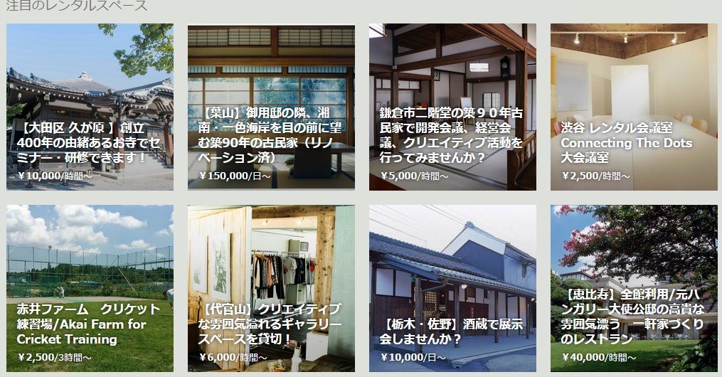 ※古民家、野球場、酒蔵、大使公邸・・・話題性のある空間が並ぶ(スペースマーケットより)