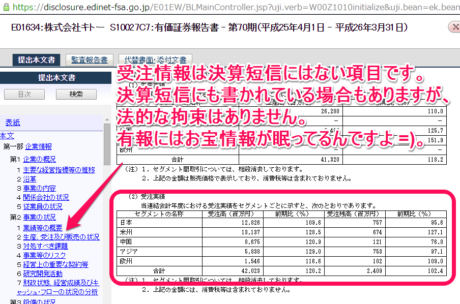 製造業で重要な情報の一つとして受注高があります。受注高とは売上の予約のようなものでして、この数値を確認する事で先の売上が薄らと見えてきます。勿論、決算短信にも受注高を掲載している場合もあるのですが、有報のみと言う企業も結構あります。