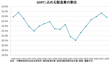 GDPに占める製造業の割合は、1990年に右肩下がりで20%程度まで低下したが、2002年を底に右肩上がりになって08年には23.5%程度まで上昇した。原因は円安だ。超金融緩和や度重なる為替介入によってバブルとまで言われた円安になり、縮小の一途だった輸出製造業が復活した。2002年から始まった戦後最長の景気回復は、輸出主導型だった。その輸出主導型経済が、リーマンショック以後の円高でダメージをこうむっている。
