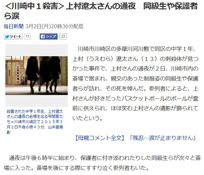 神奈川県川崎市の河川敷で無残にも殺害されているのが発見された中学1年生男子・上村(うえむら)遼太君の告別式が3月2日、同市内の斎場で営まれたという。