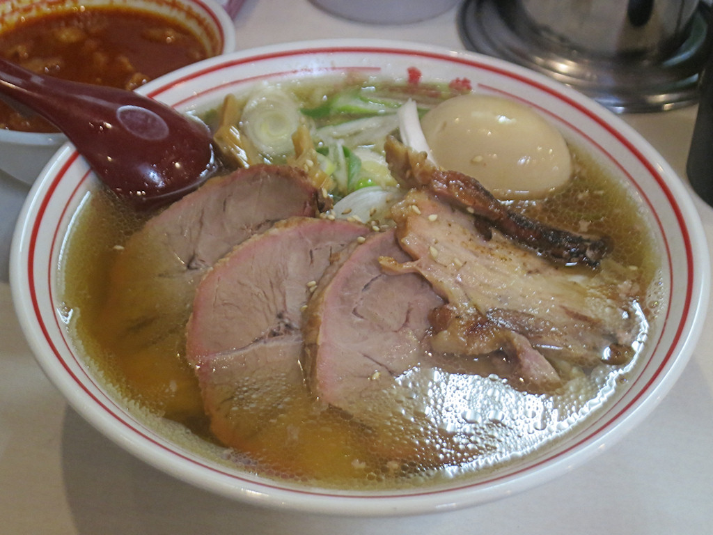 チャーシューは豚肩肉と思われる脂身の少ない噛み応えのある部位と、通常メニューの豚バラ肉の二種類、別々に仕込んでいるような印象を受けました(未確認です)。