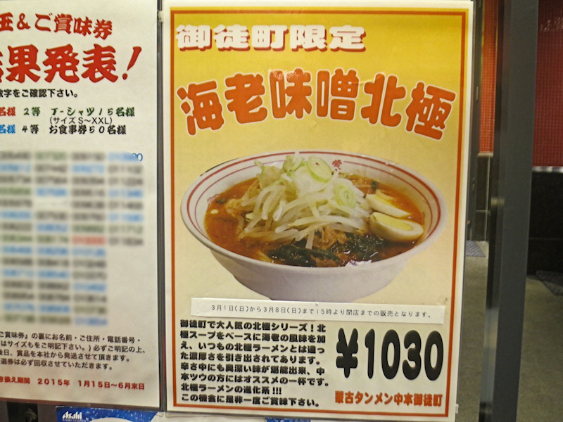 海老味噌北極1030円の麺少なめ、3/1から3/8までの15時以降のみの販売となります。