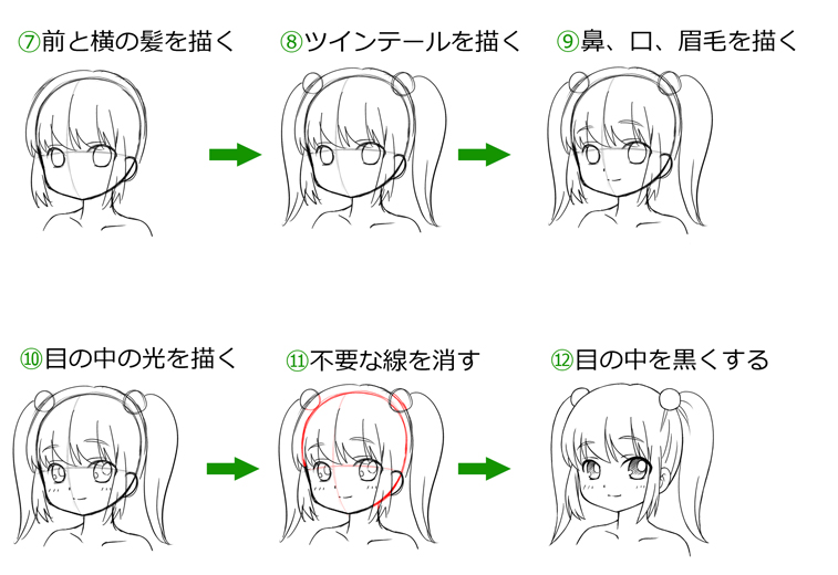 これで、顔の完成です!!つり目でツインテールの女の子☆