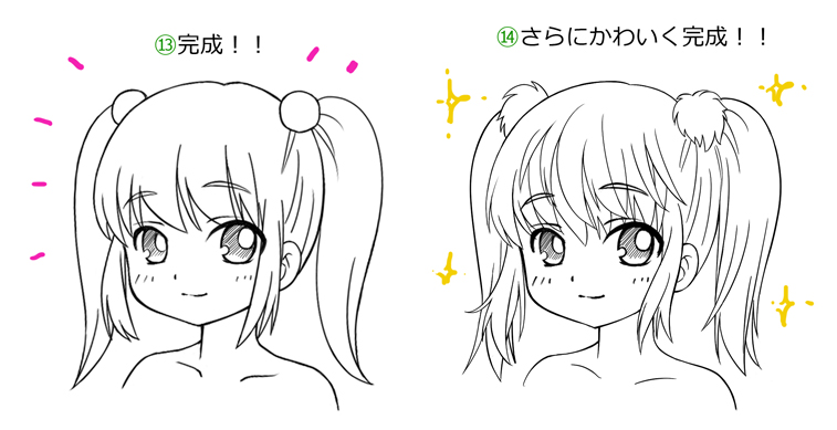 もっとかわいく完成させるには、髪の毛を細かく描いたり、