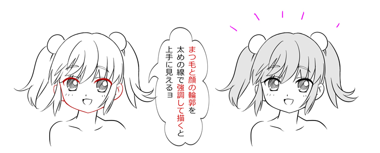 簡単に上手にみせるコツは、まつ毛と顔の輪郭を強調して描くこと(^○^)