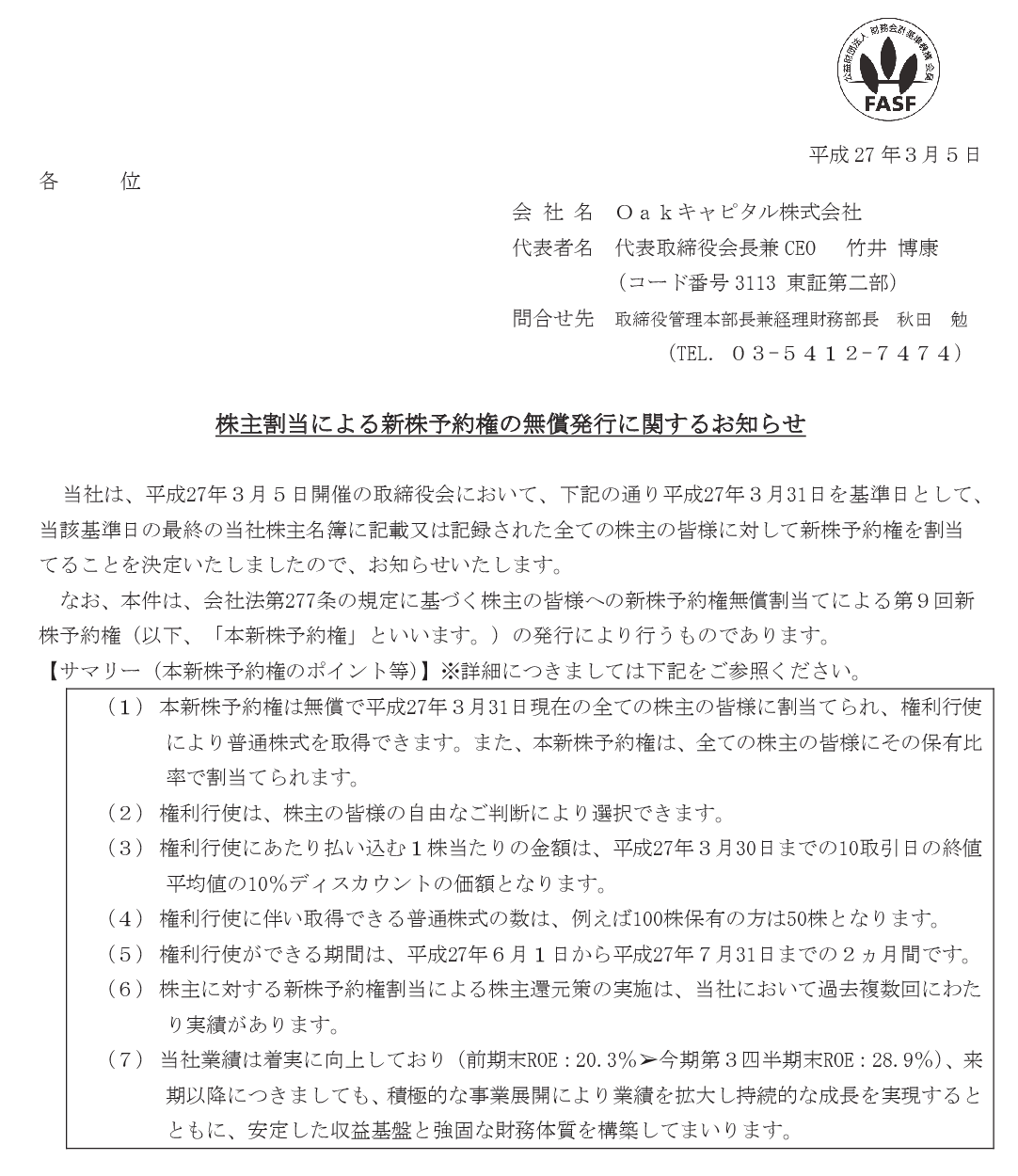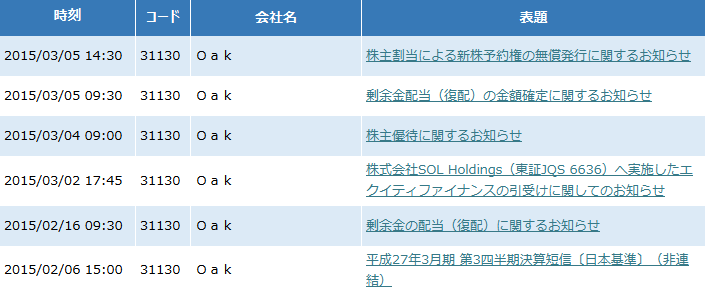 2015/03/05 14:30 Oakキャピタル 株主割当による新株予約権の無償発行に関するお知らせ