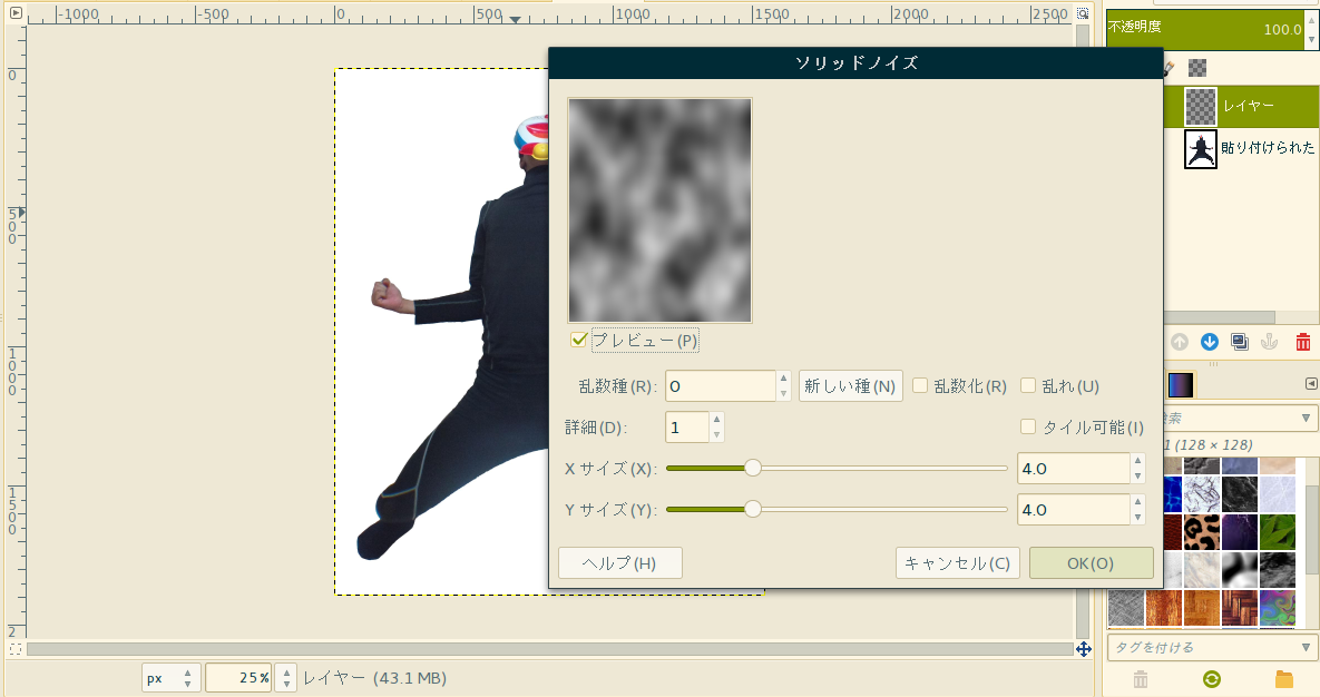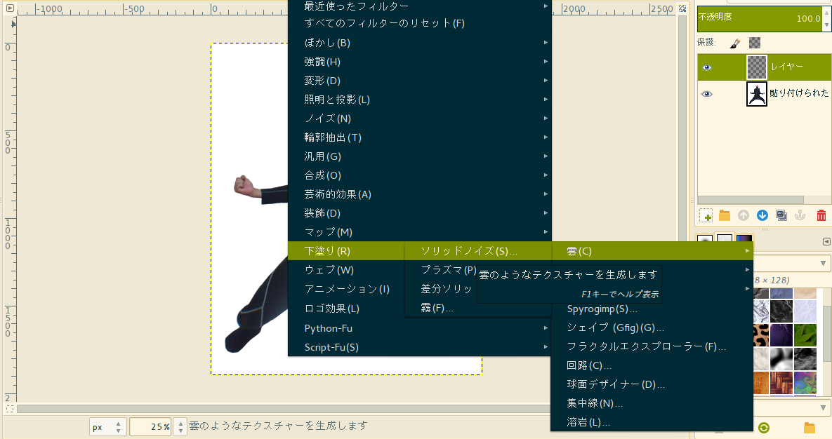 上部タブ「フィルタ」->下塗り->雲->ソリッドノイズ