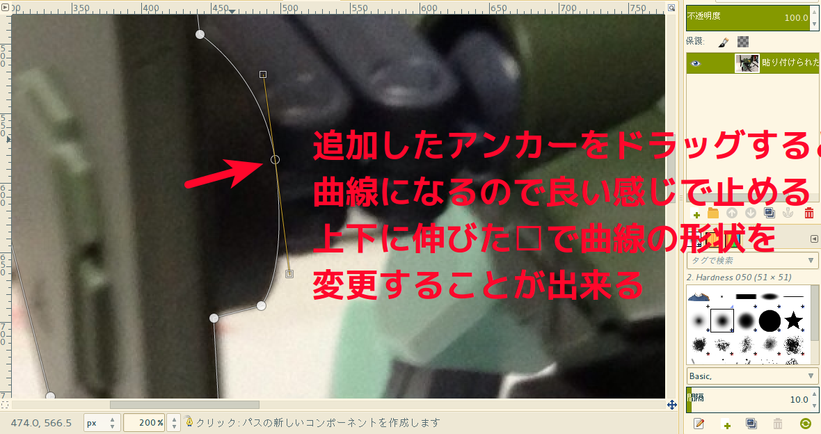 追加したアンカーをドラッグして曲線を作る