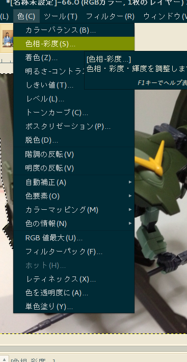 上部タブ「色」->色相-彩度