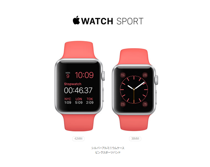 「Apple Watch」は大小の2パターンあり。男女での差別化が予想されます。大きい方は42MMモデル。小さい方は38MMモデルとなっています。