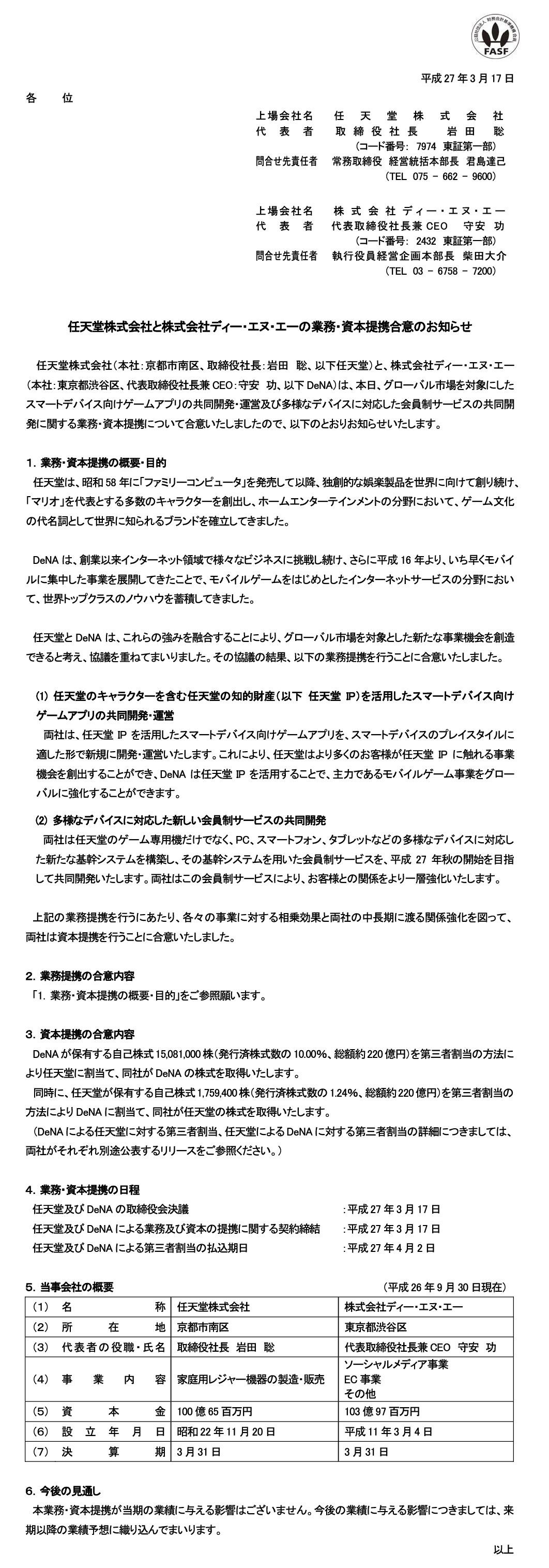 [任天堂HP] 「任天堂株式会社と株式会社ディー・エヌ・エーの業務・資本提携合意のお知らせ」(PDF)を掲載しました。 http://t.co/4HCws81IqU