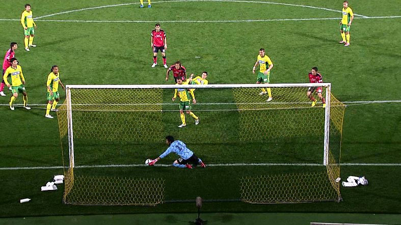 ※後半ATの山下同点弾。GK高木が一度弾いたボールをきわどいところでかき出しました。判定はゴールイン。