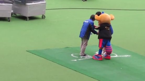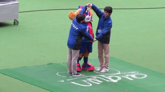 ハーフタイムのドロンパ。バニシングスプレーで何か書いてた。umbroのロゴらしい。 http://t.co/30TmZcm3d8