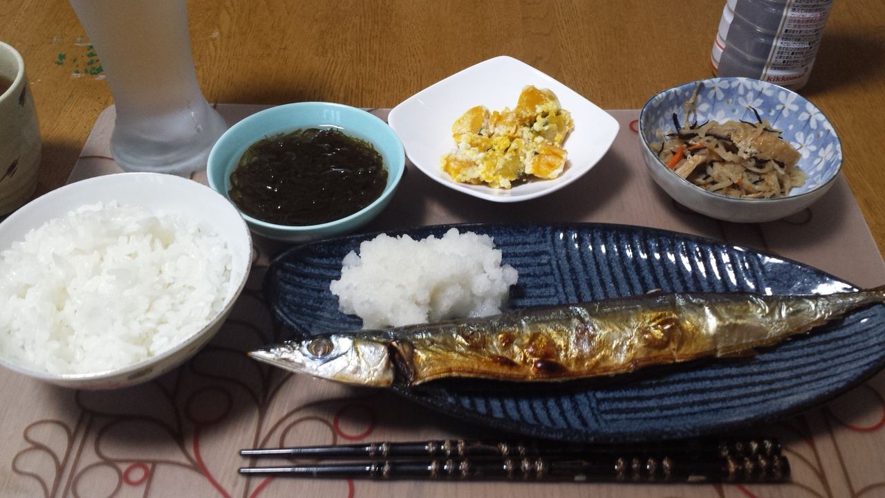 (前日のカレー鍋?) (朝食;サンマ)