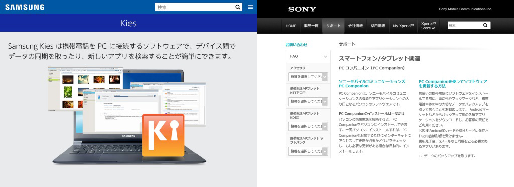 iOSデバイスにおけるiTunesほど強力ではありませんが、サムスン電子とソニーモバイルコミュニケーションズはそれぞれ自社製端末専用のユーティリティーソフトを用意しています。