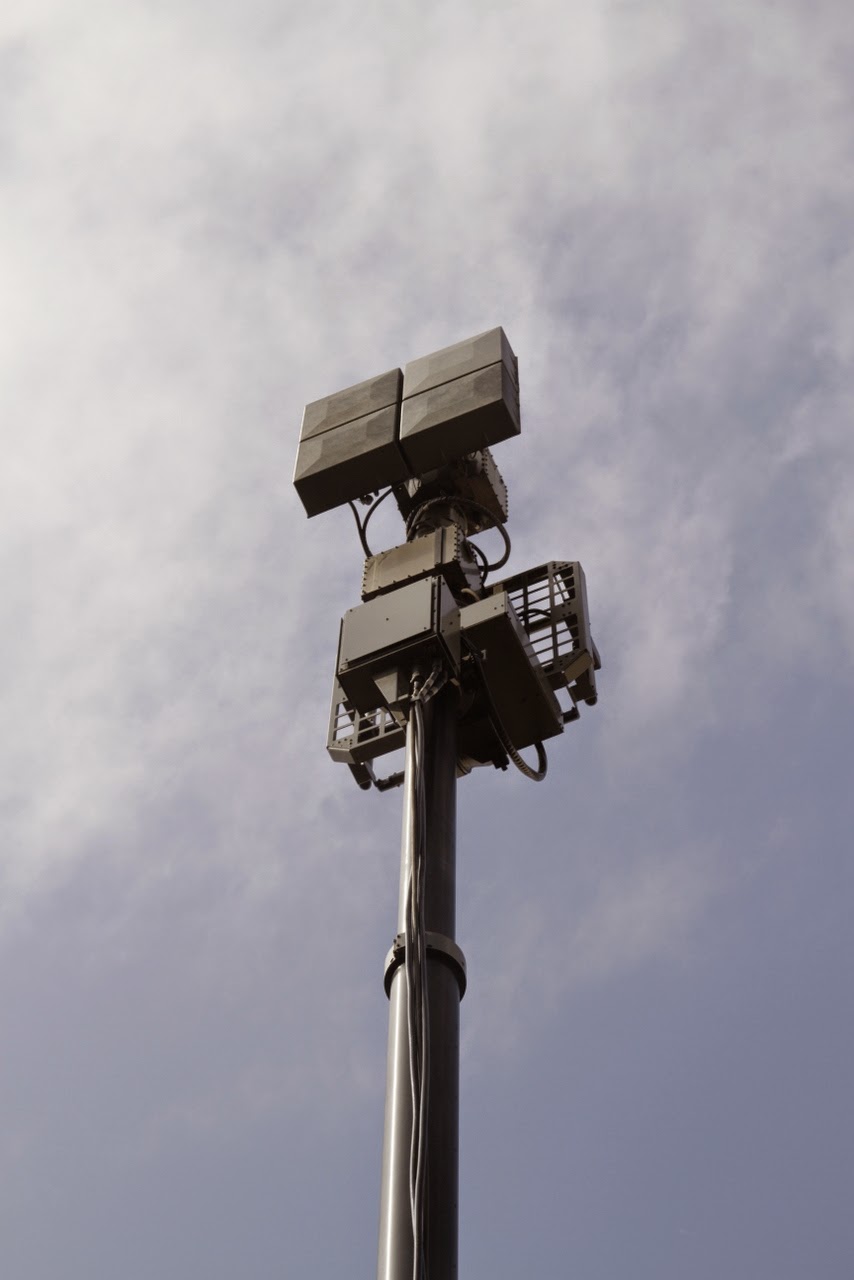 他の器材のアンテナが隊員たちの手で組み立てられていく中、自動で伸びていく野外通信システムのアンテナ。