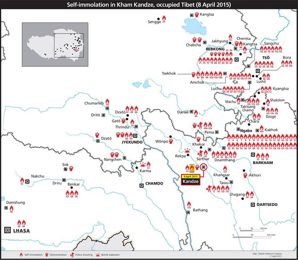 これまでチベット内で起こった主な抵抗運動と焼身発生地を示した地図。マークされているのが今回のカンゼ。