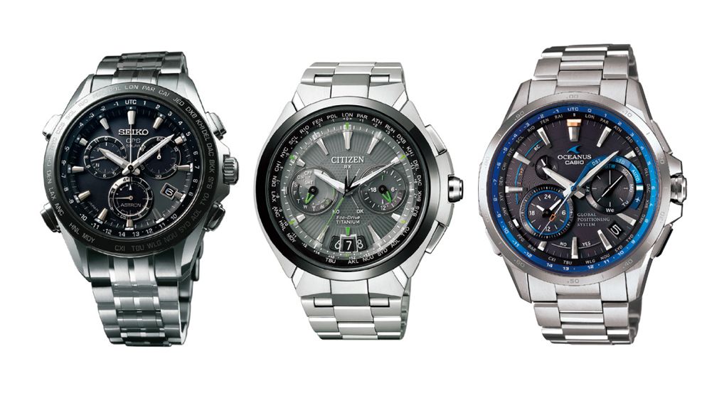 左からセイコー「アストロン」、シチズン「アテッサ」、カシオ「オシアナス」