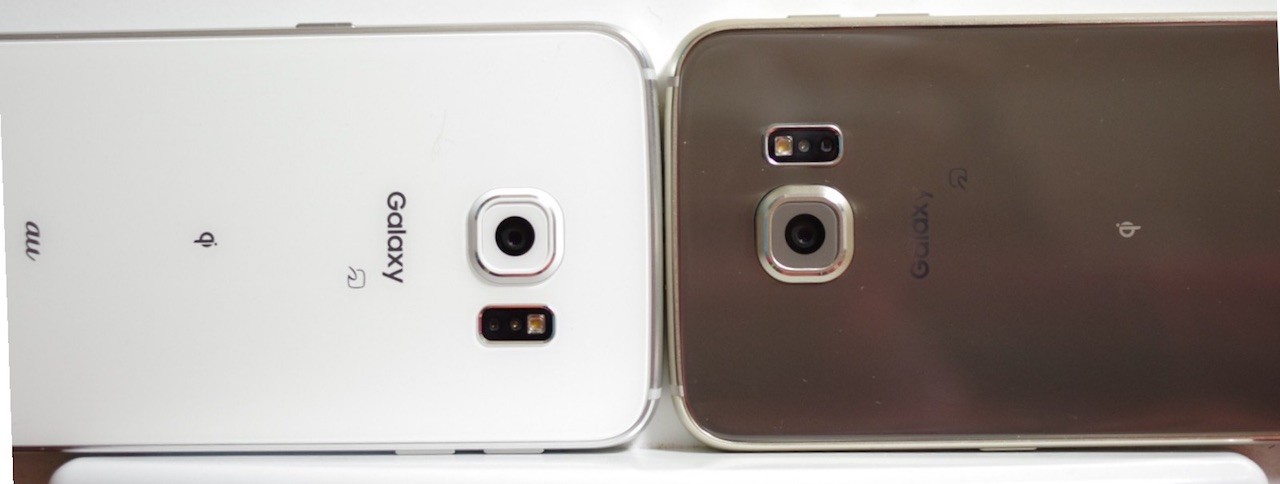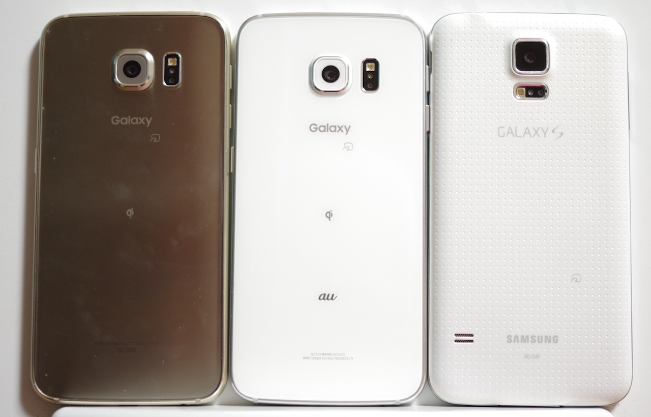 NTTドコモ版とau版の比較。左からNTTドコモのGalaxy S6 SC-05G、Galaxy S6 edge SC-04G、auのGalaxy S6 edge SCV31だが、どの機種にもSamsungロゴはない