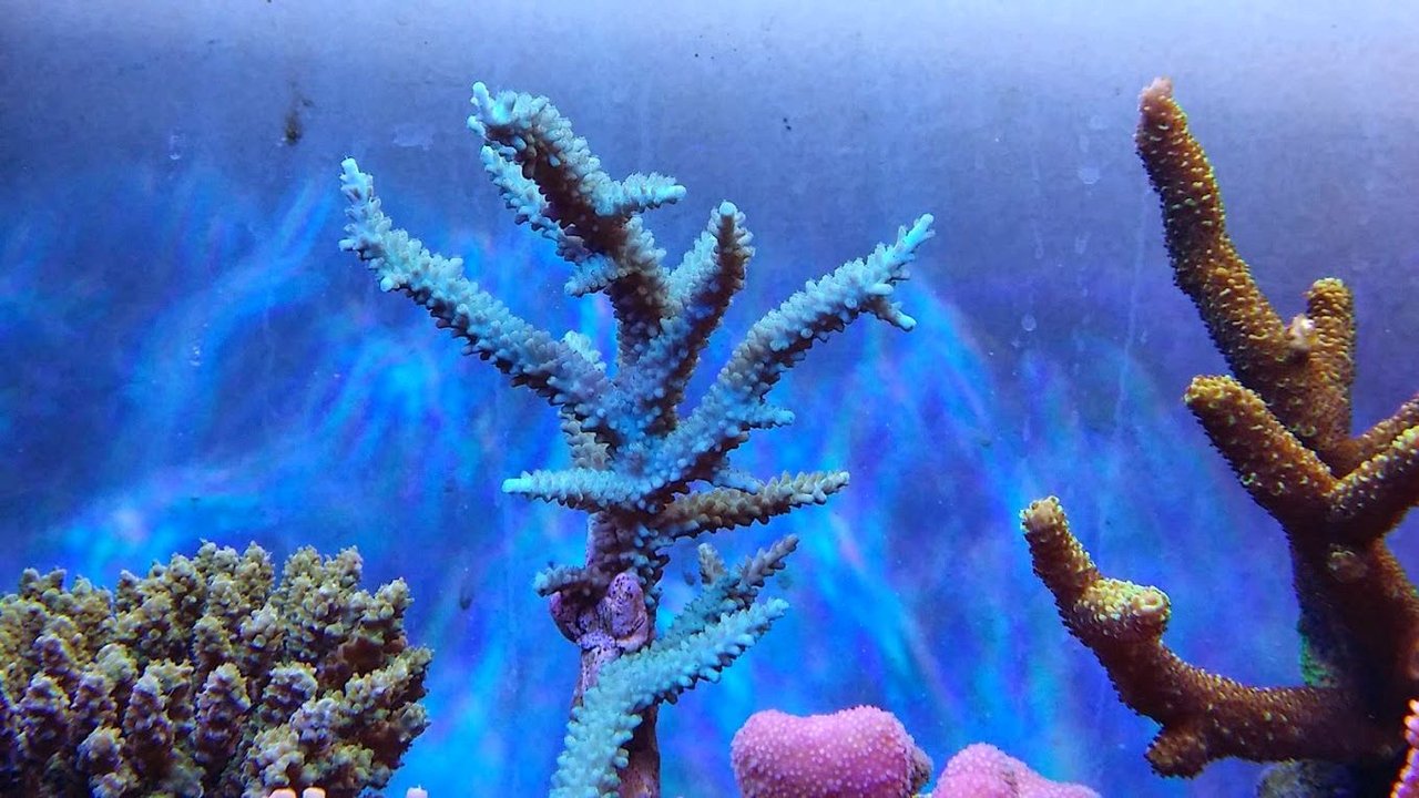 綺麗なアイスブルーです。右のスギは蛍光グリーン(ブリード)なのですがポリプが茶色^^;